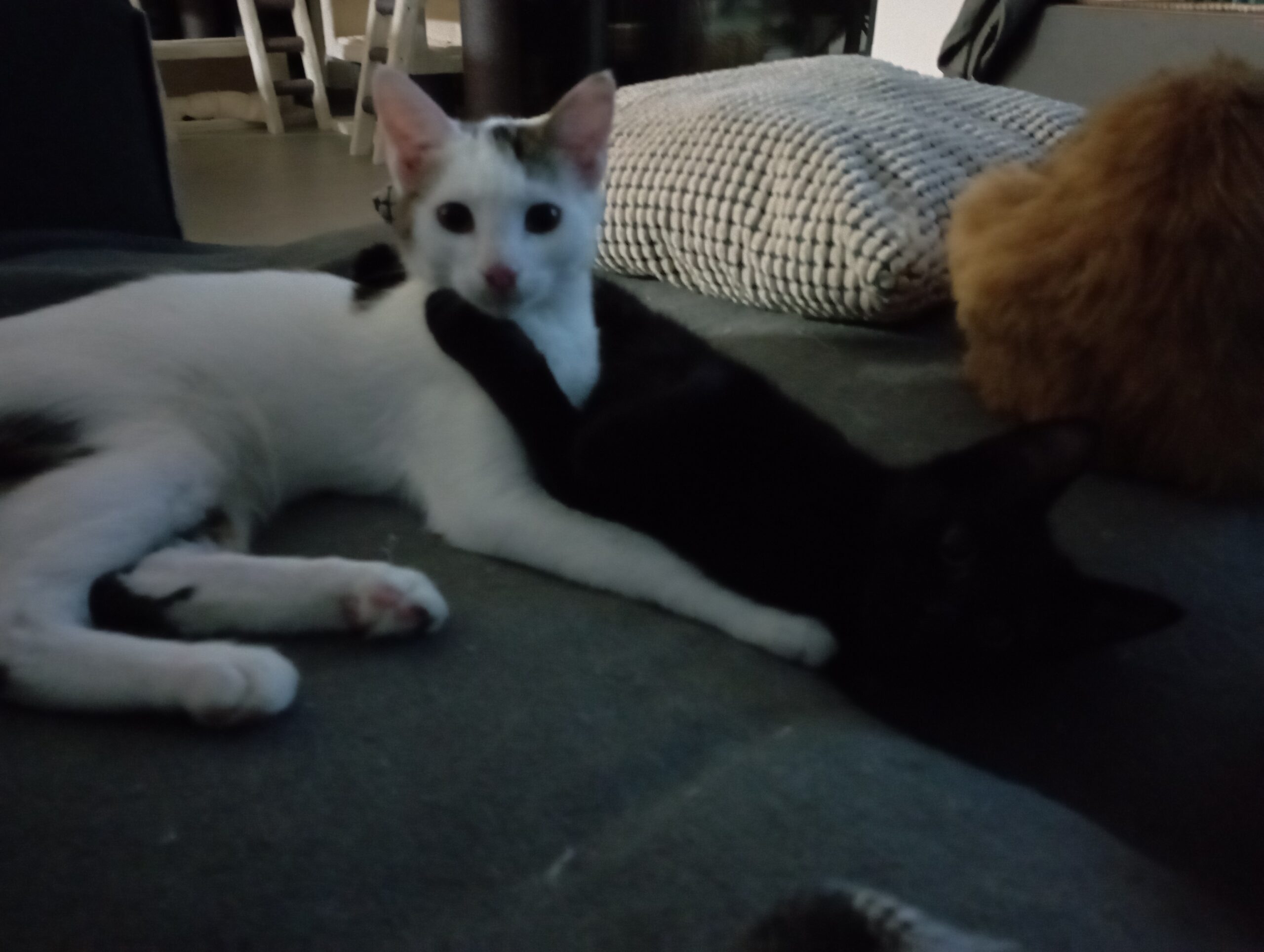Gust (weiß mit tiger) ist noch etwas vorsichtig, aber genießt auch schon die Streicheleinheiten. Nero (schwarz) ist ein quirliger kleiner Clown mit dem man einfach nur lachen muss